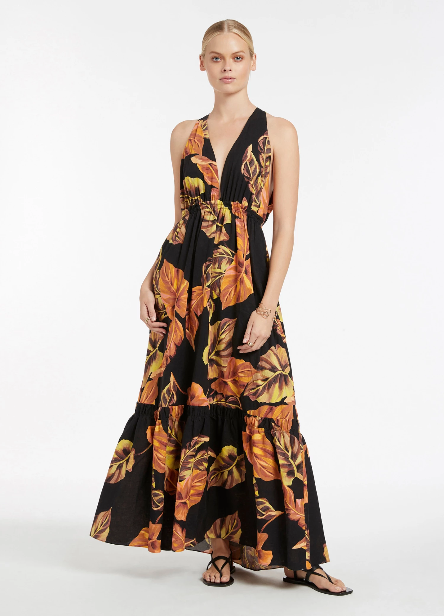 The Palmas Plunge Maxi Dress inspired by the tropical jungles is an elevated soft-to-touch resort wear style for warm weather. This tiered maxi dress comprises a relaxed fit complemented by a loop back design and soft elasticated waistline for a flattering waisted silhouette. Β