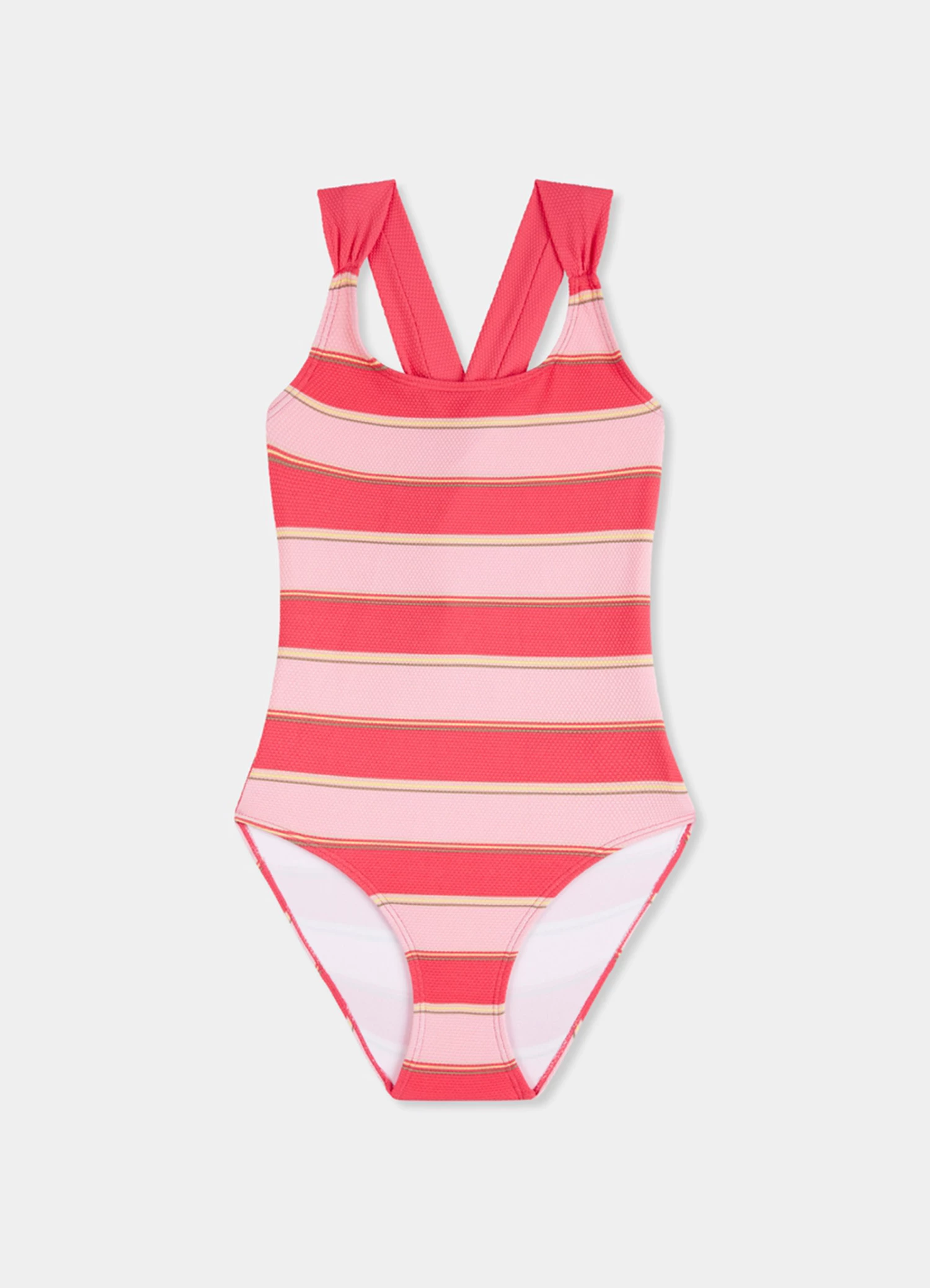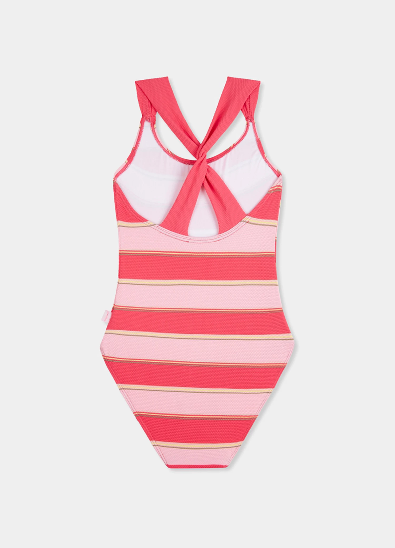 The Seafolly Summer Holiday Twist Back One Piece for girls features twisted back straps for both fun styling and comfort. This one piece is complete with a vibrant summer stripe print perfect for sandy days.Β