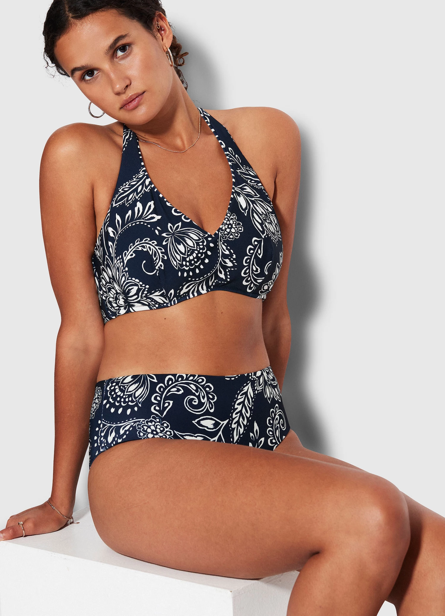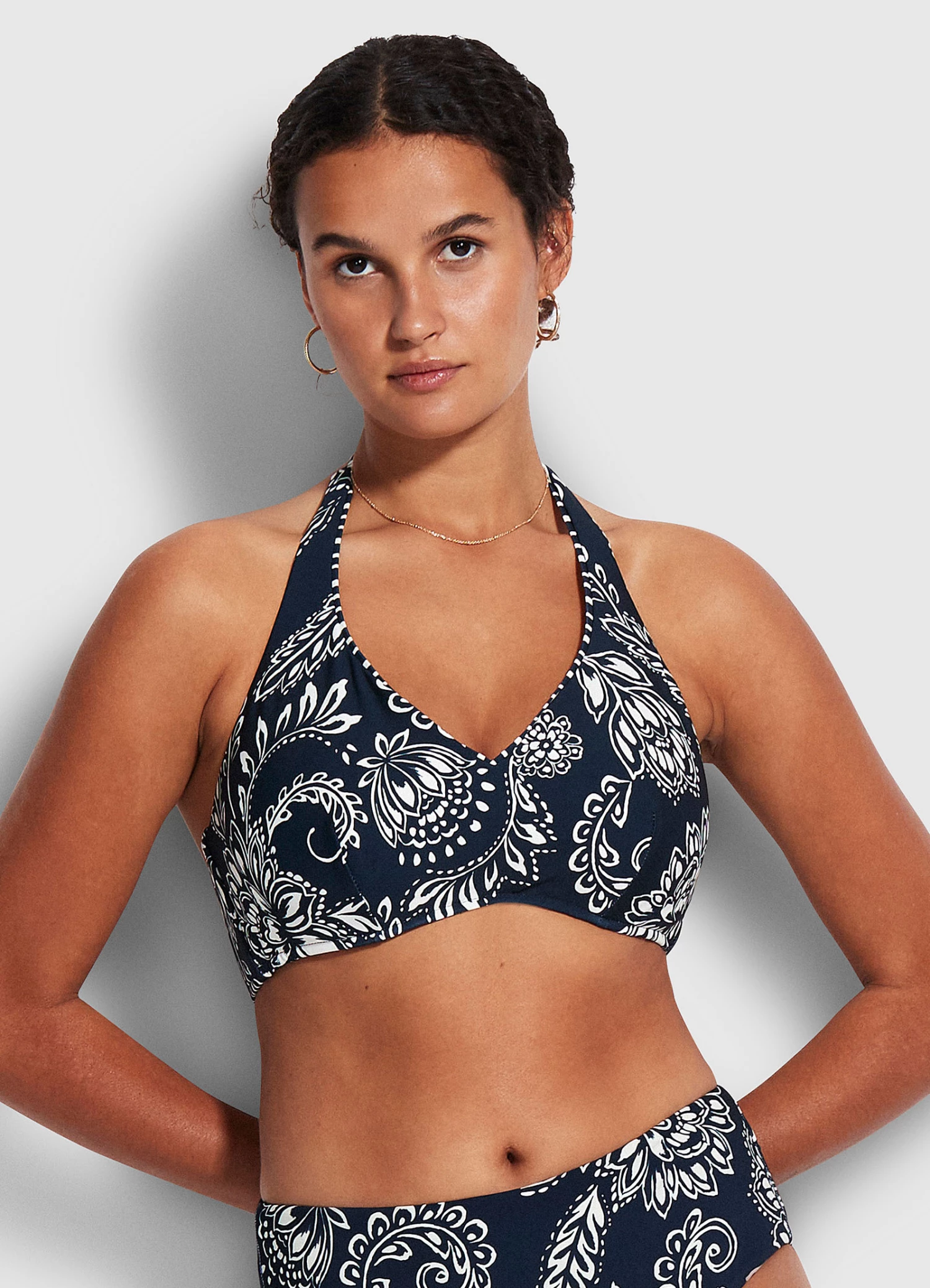 The Folklore F Cup Halter Bra is the perfect speciality fit bikini top for your wardrobe. With hidden underwire support and an adjustable e-hook at the back, this halter neck bikini is your go-to for comfort and all-day wear.ย