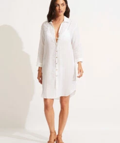 The Seafolly Embroidery Tier Dress is the perfect overswim beach dress. The tiered detailing is ideal for a loose fitting summer style and finished with the dainty tie straps, this beach dress is a must-have.Β