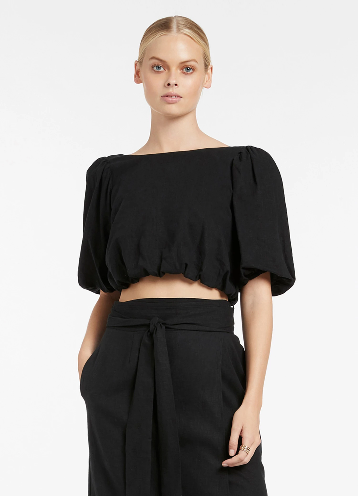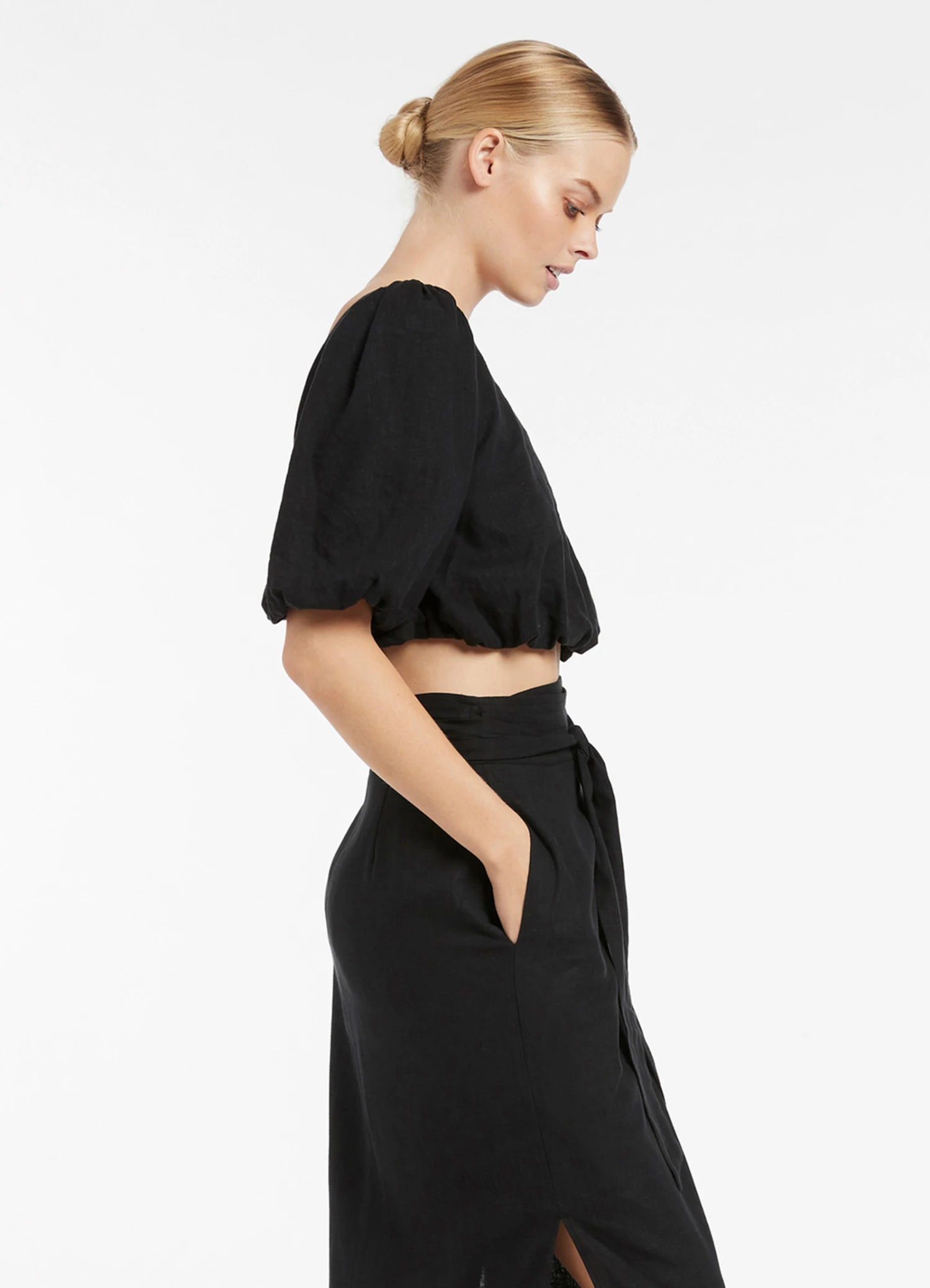 The Palmas Puff Sleeve Top is a classic cropped hem style crafted from a soft-to-touch linen viscose blend. The puff sleeves and simplistic design adorns the gathered waistband to complete the feminine silhouette.Β