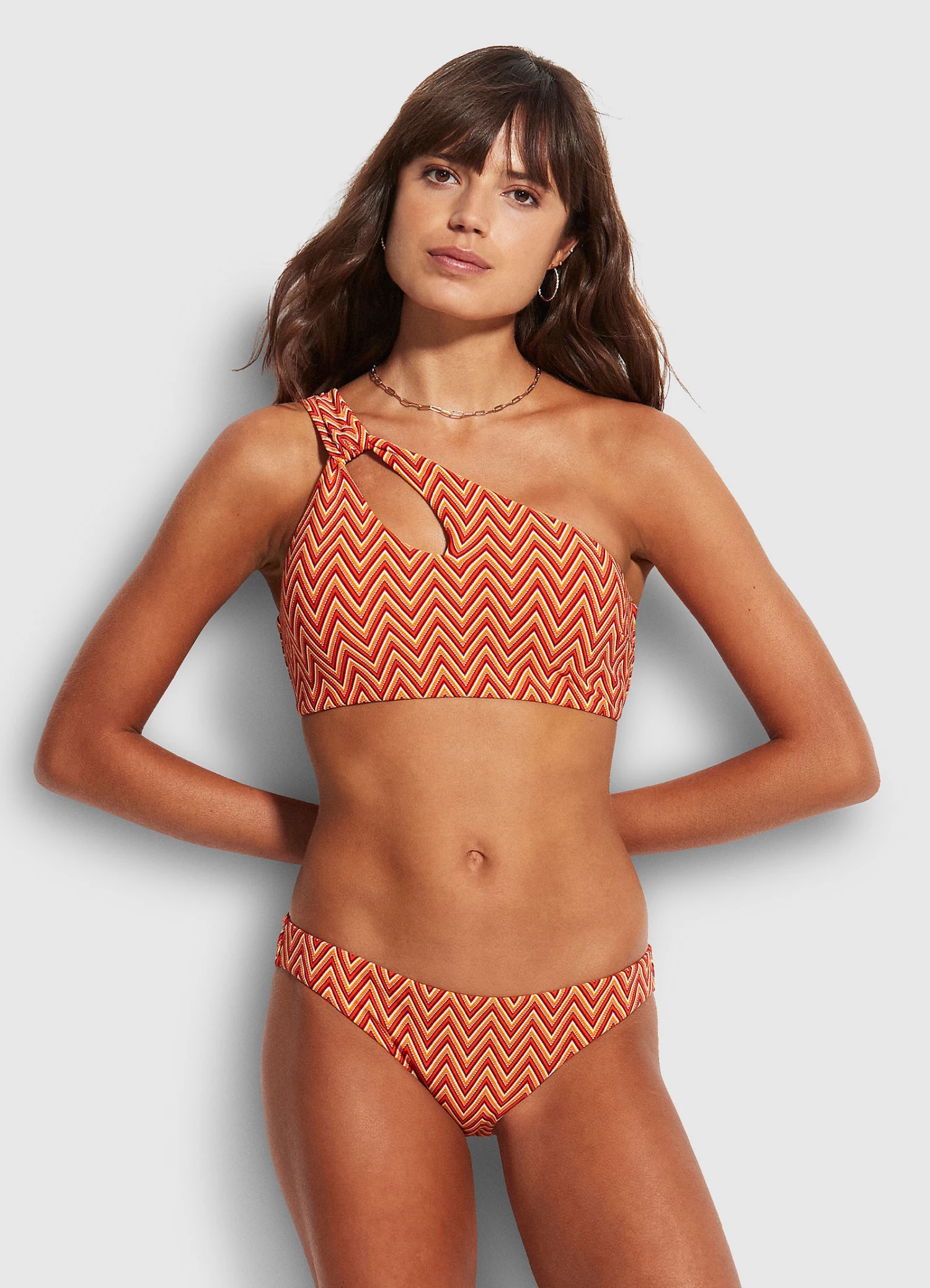 This is Cleo, a 70’s inspired chevron jacquard that has been developed by a specialised knitting machine in France. This mill is favoured by the Seafolly design team for its extensive archival collection of fabrics that date back to 1904.