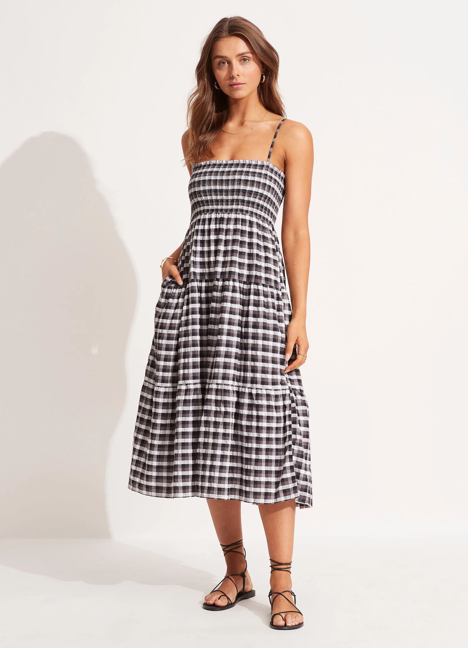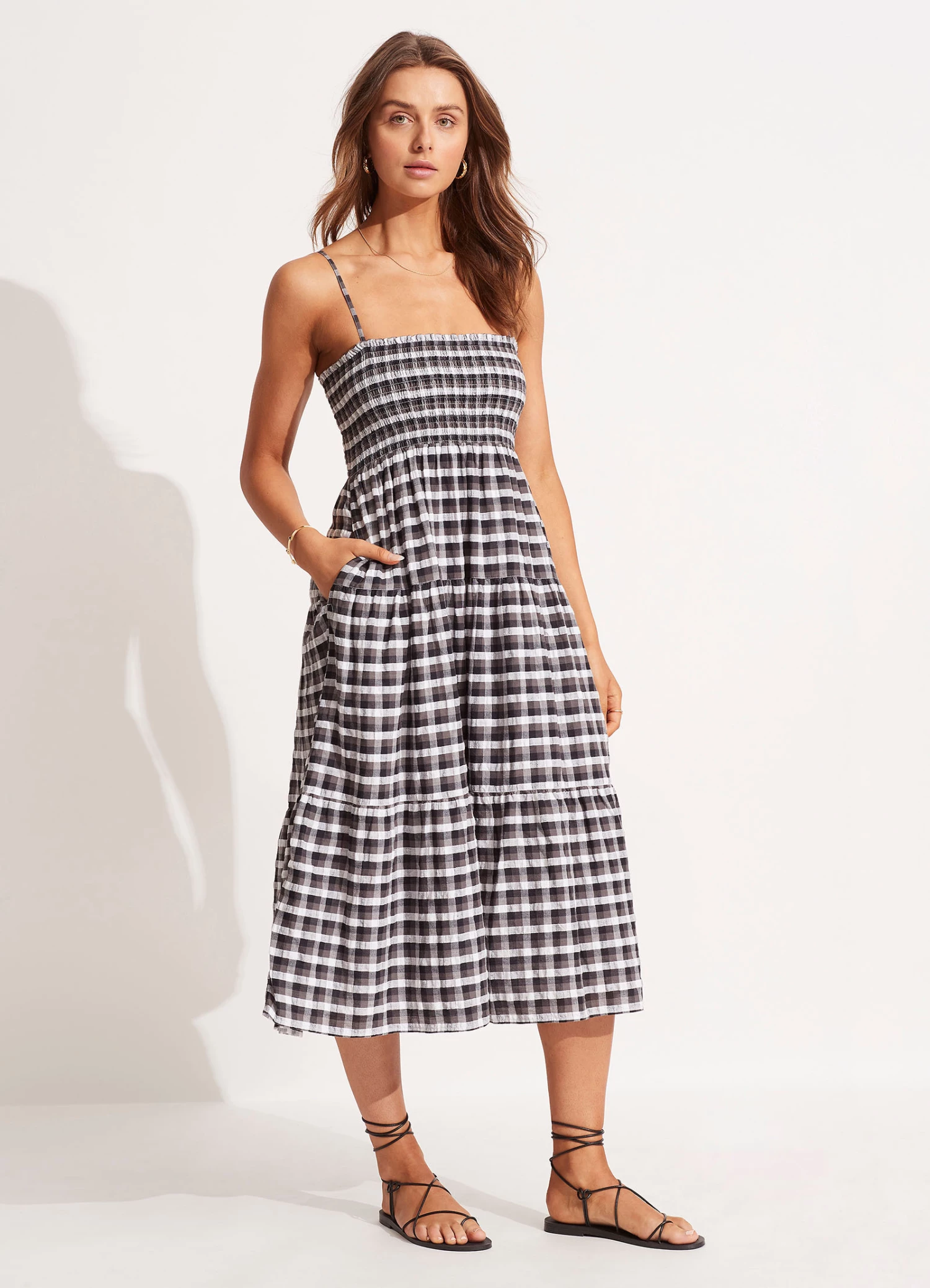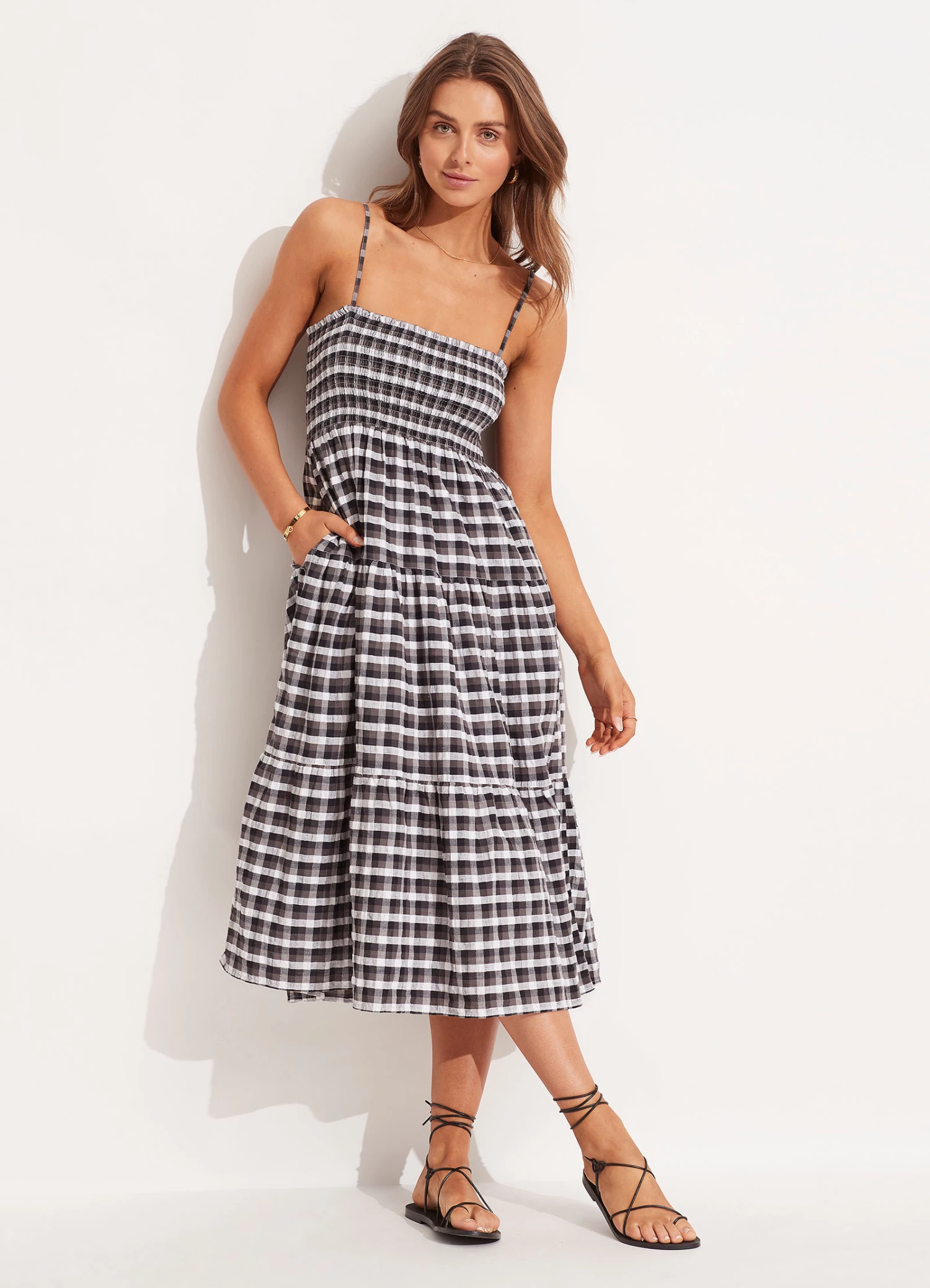 The Portofino Gingham Midi Dress is an effortless summer overswim piece crafted from 100% Cotton. This gingham dress features shirred detailing and adjustable straps for a versatile day to night summer dress.Β