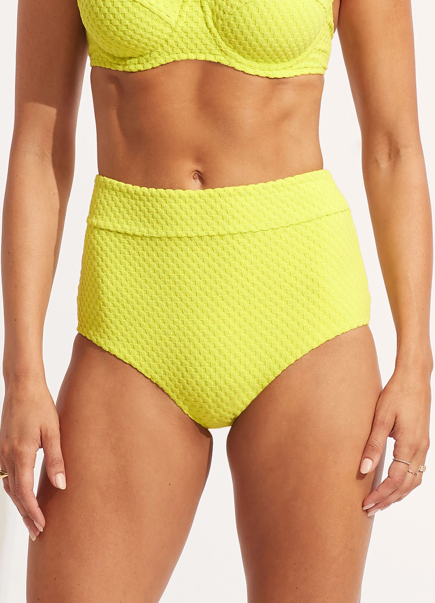 The Riviera High Waisted Bikini Bottom is a full coverage and low legline classic pant. The banded waistline complete with a textured terry towelling fabric creates a retro summer look for all-day comfort.Β