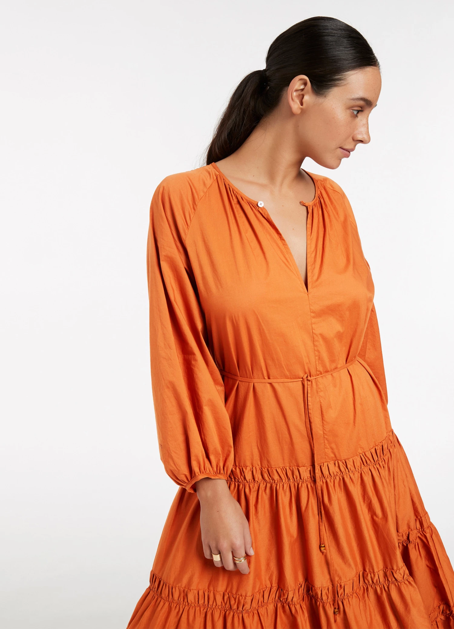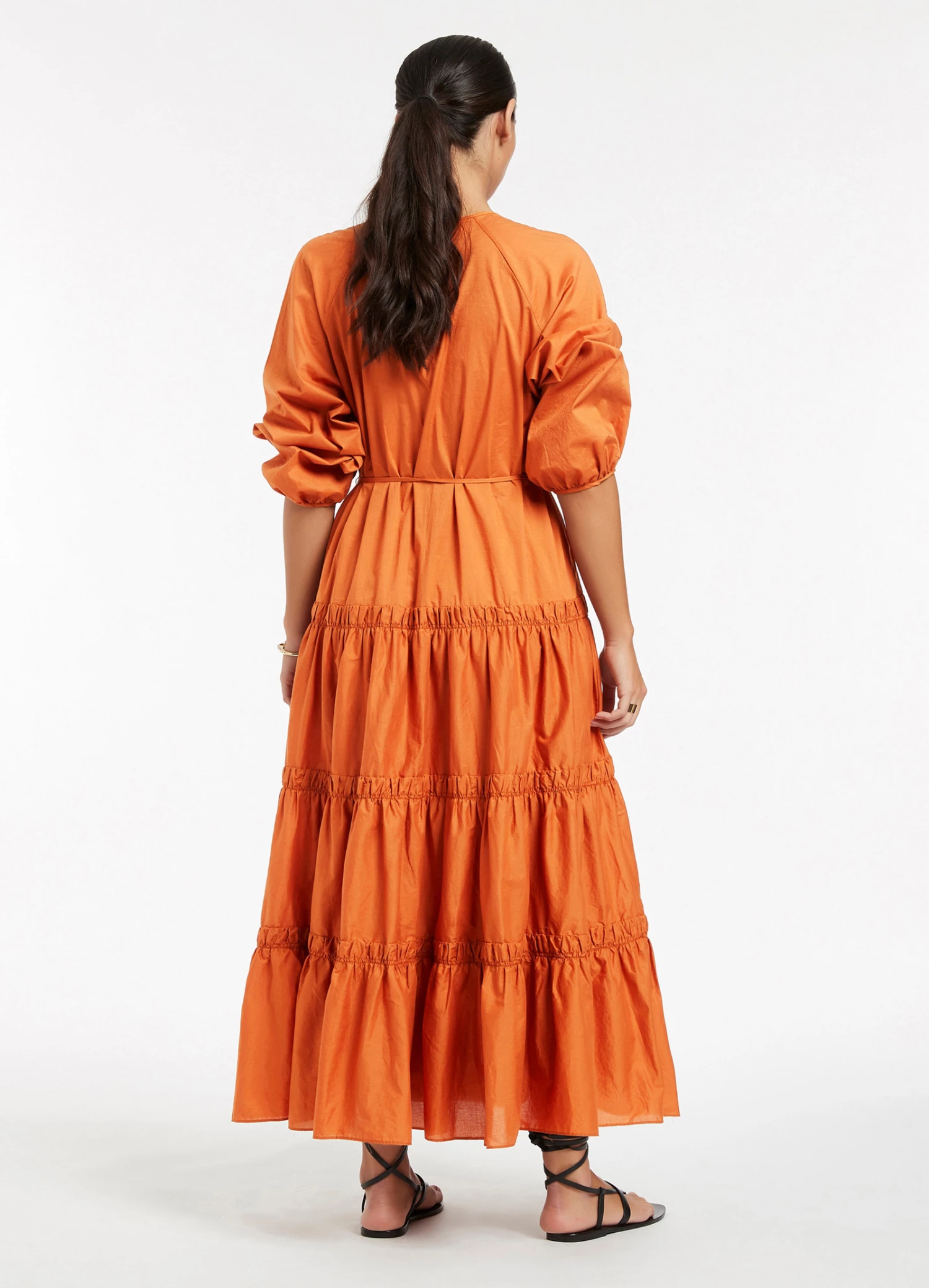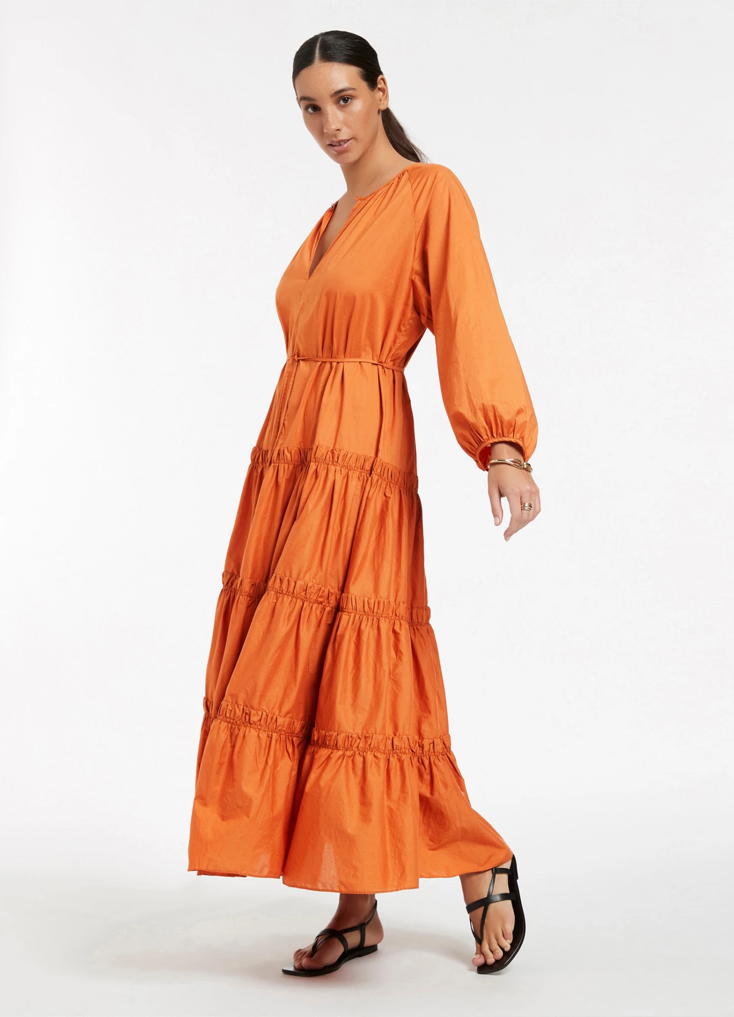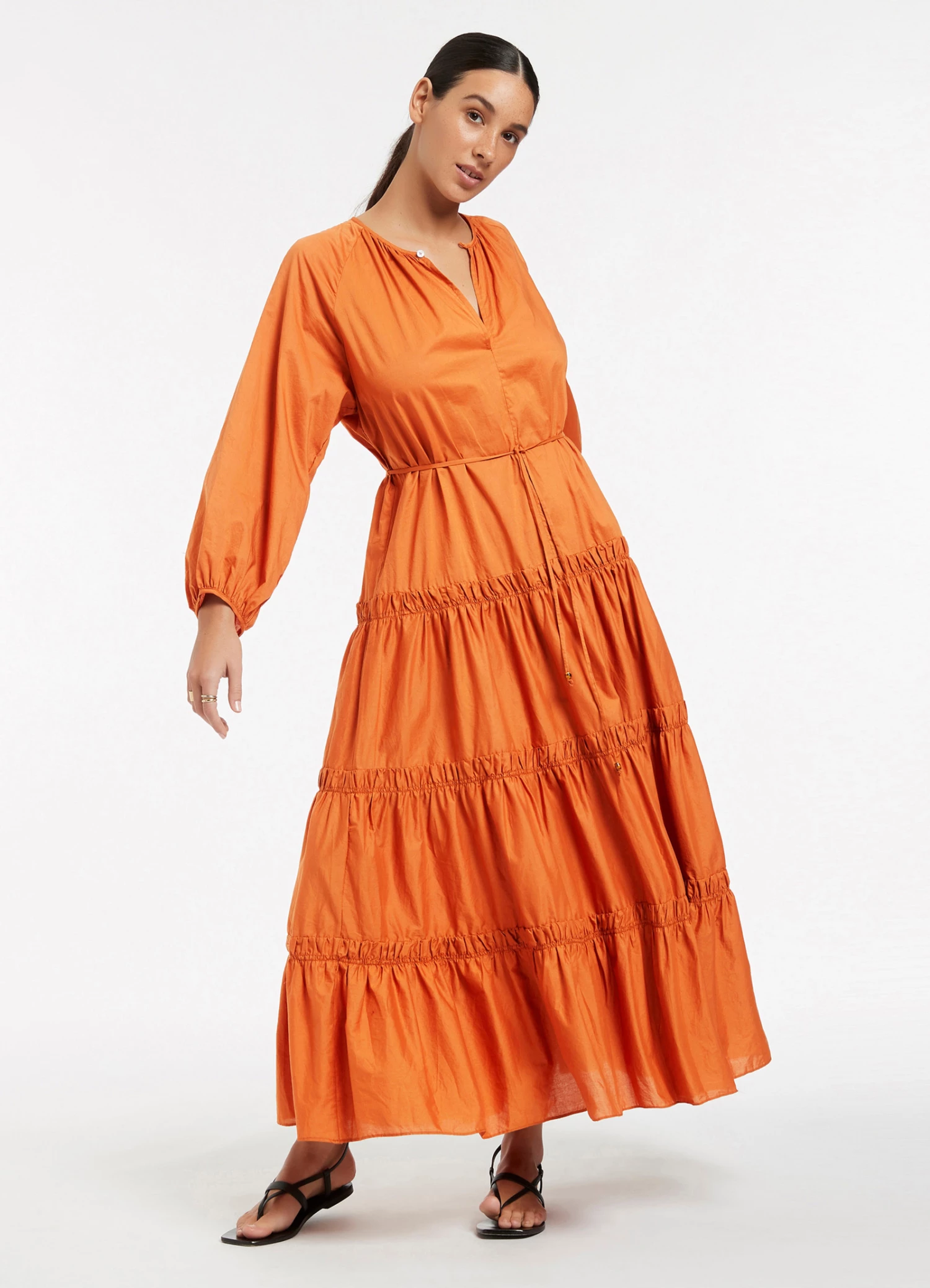 The JETSET Tiered Maxi Dress is crafted from crisp cotton-poplin with a soft to-touch composition. A tonal belt adorned with bead trim cinches the silhouette before graduating into a full hem skirt β the perfect warm weather maxi dress, designed for effortless luxe style.Β
