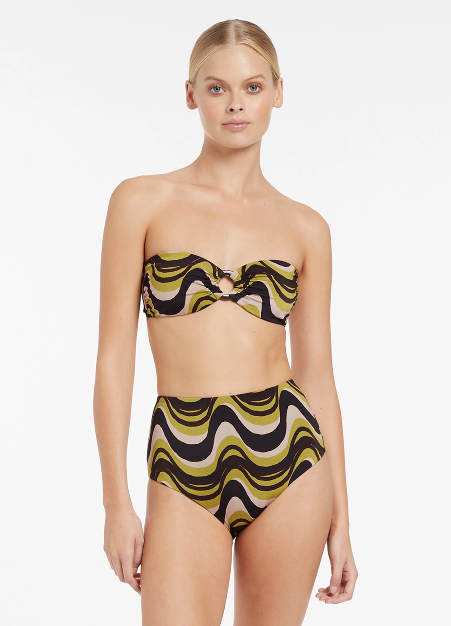 The Ascenso High Leg Trim Bikini Bottom combines statement print and classic styling. The high rise design perfectly shapes the figure, and complete with a wood look detail, this bikini bottom is an elevated warm weather silhouette.