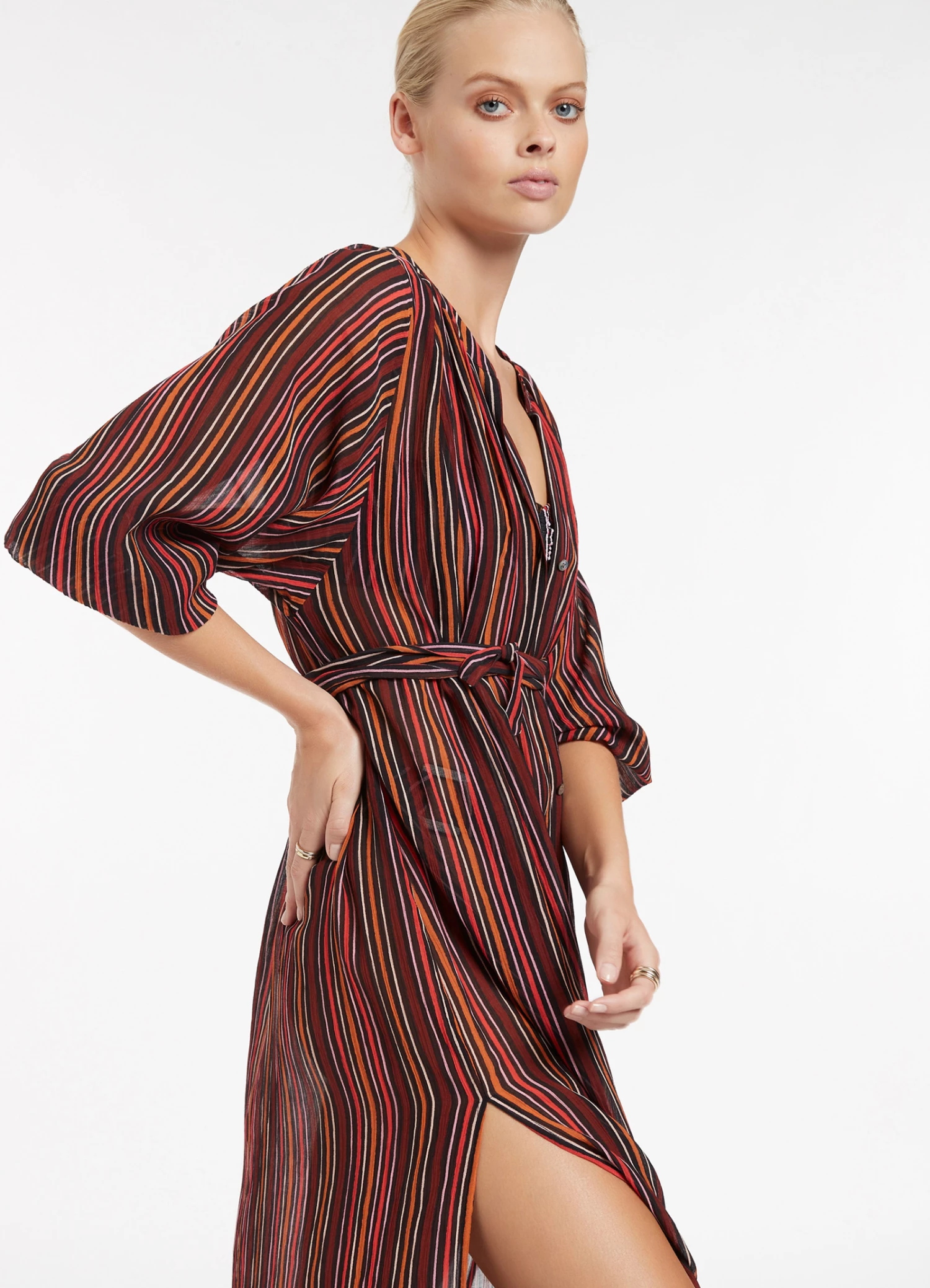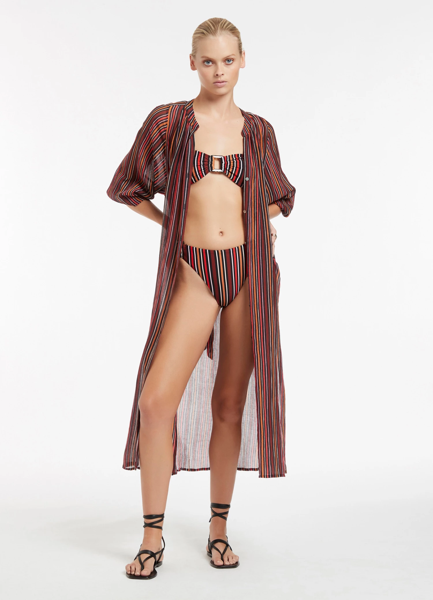 The JETS Bedouin Stripe Resort fabrication is made of featherweight cotton and silk crinkle fabric. This material is our feminine take on resort wear, it is beautifully soft and sheer, so when wearing it you feel light and feminine.