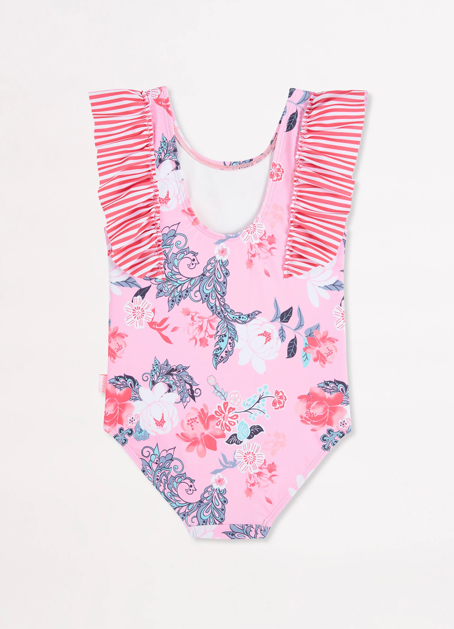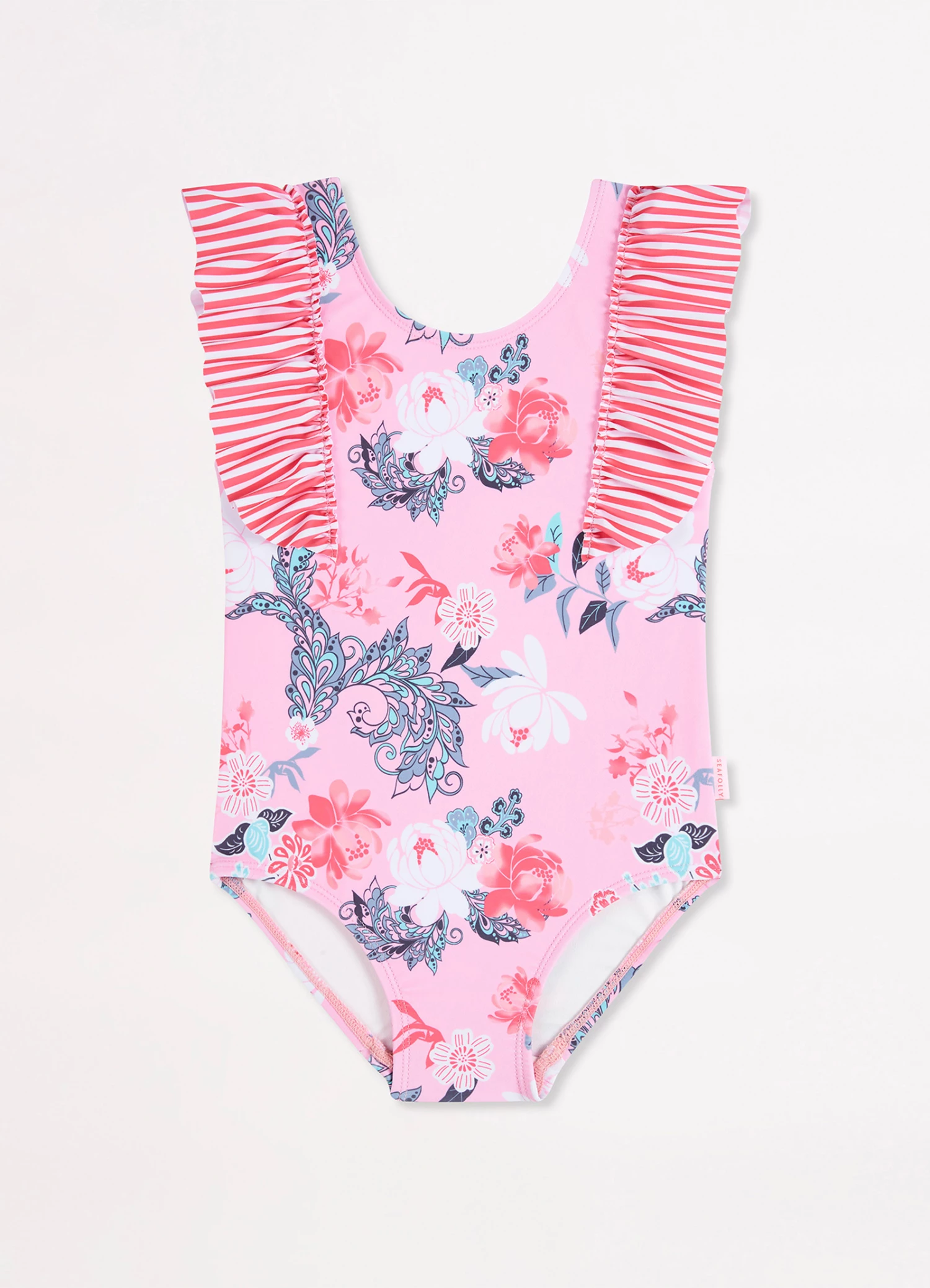 The Seafolly Summer Holiday Ruffle One Piece for girls is a vibrant summer print one piece, complete with frills.Β