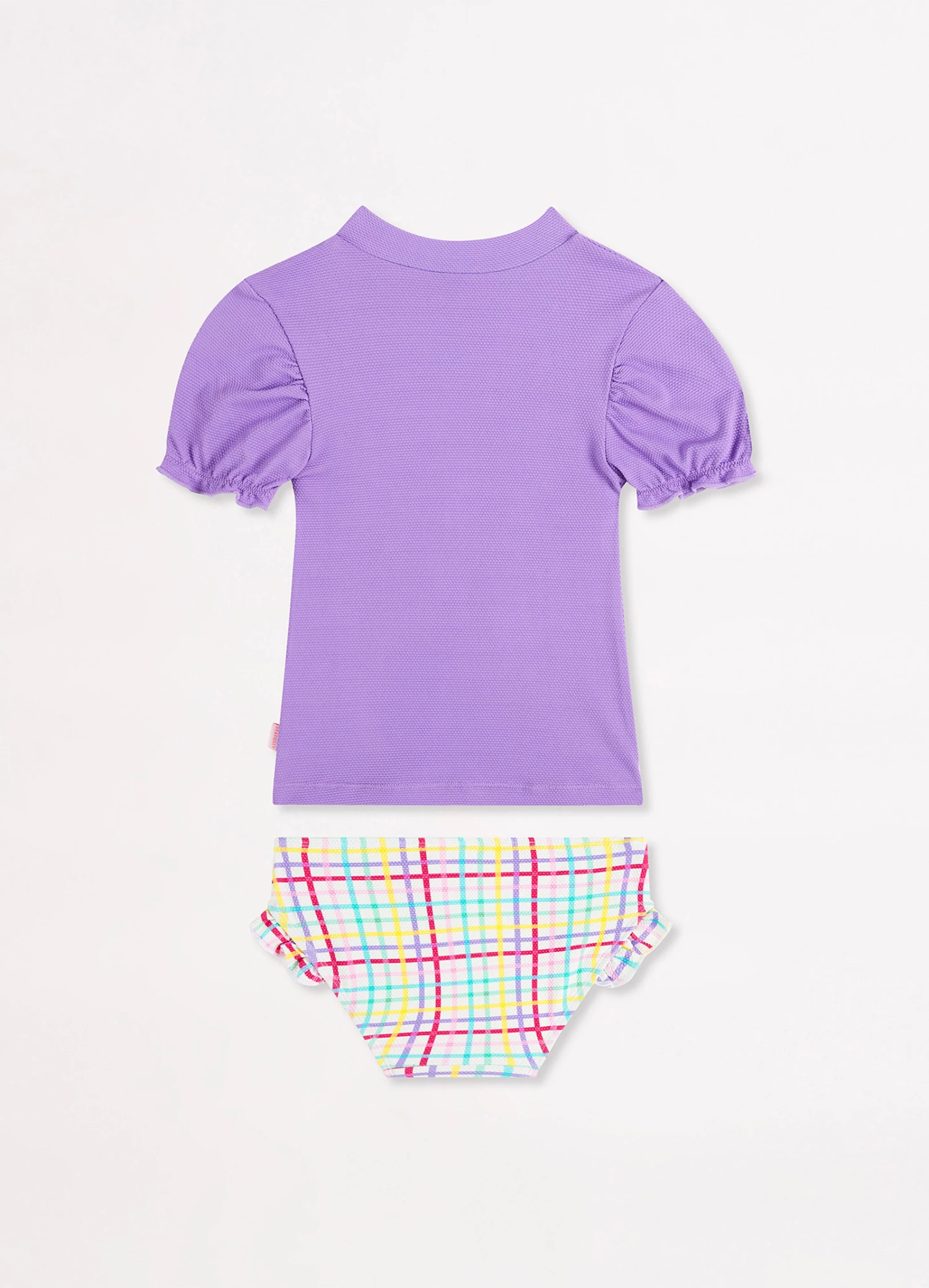 The Portifino Puff Sleeve Surf Set for girls is a short sleeve rash vest featuring puff sleeves and ruffles on the sleeves and leg opening. This surf set is perfect for all-day comfort and extra sun protection. Β