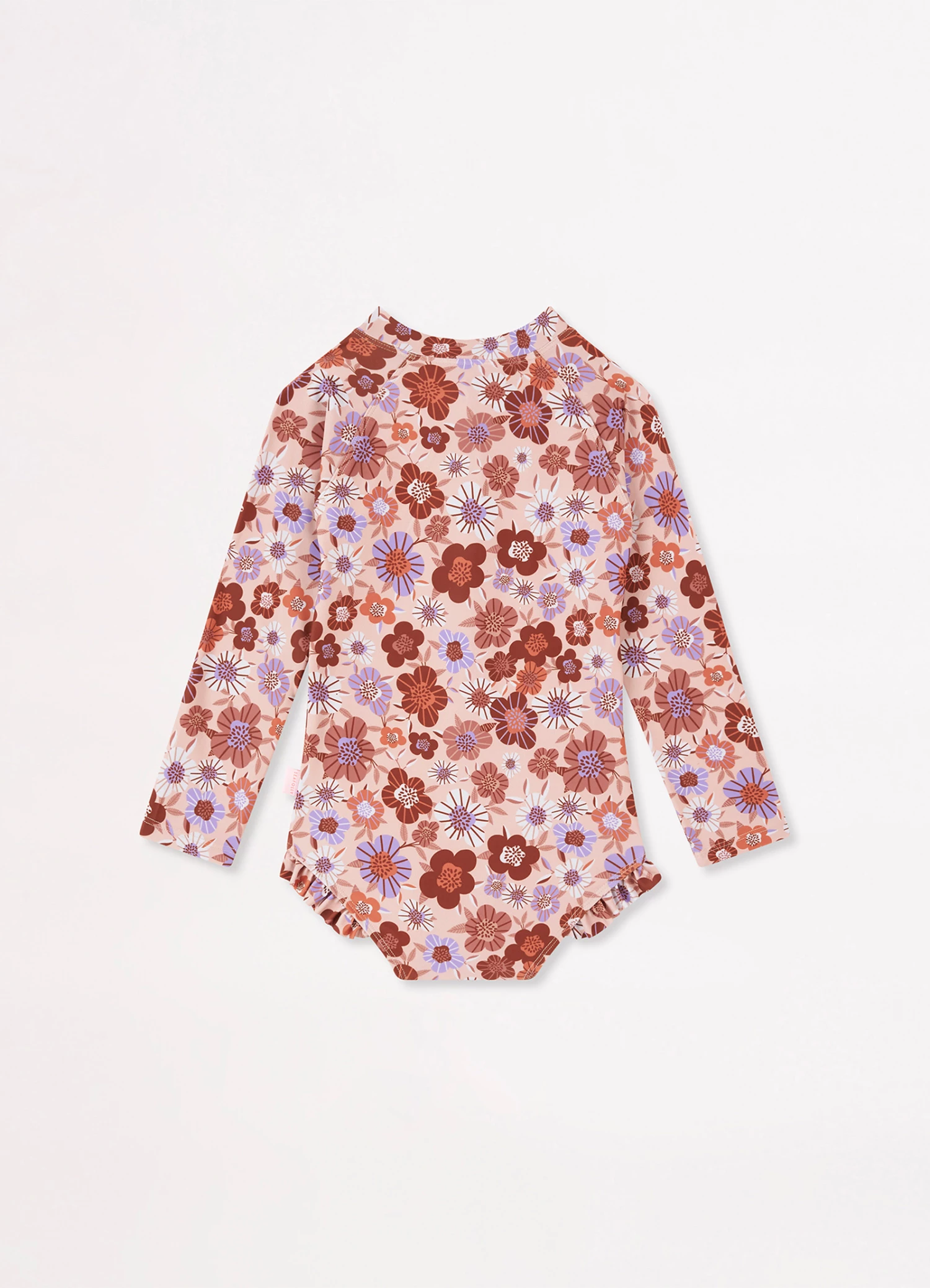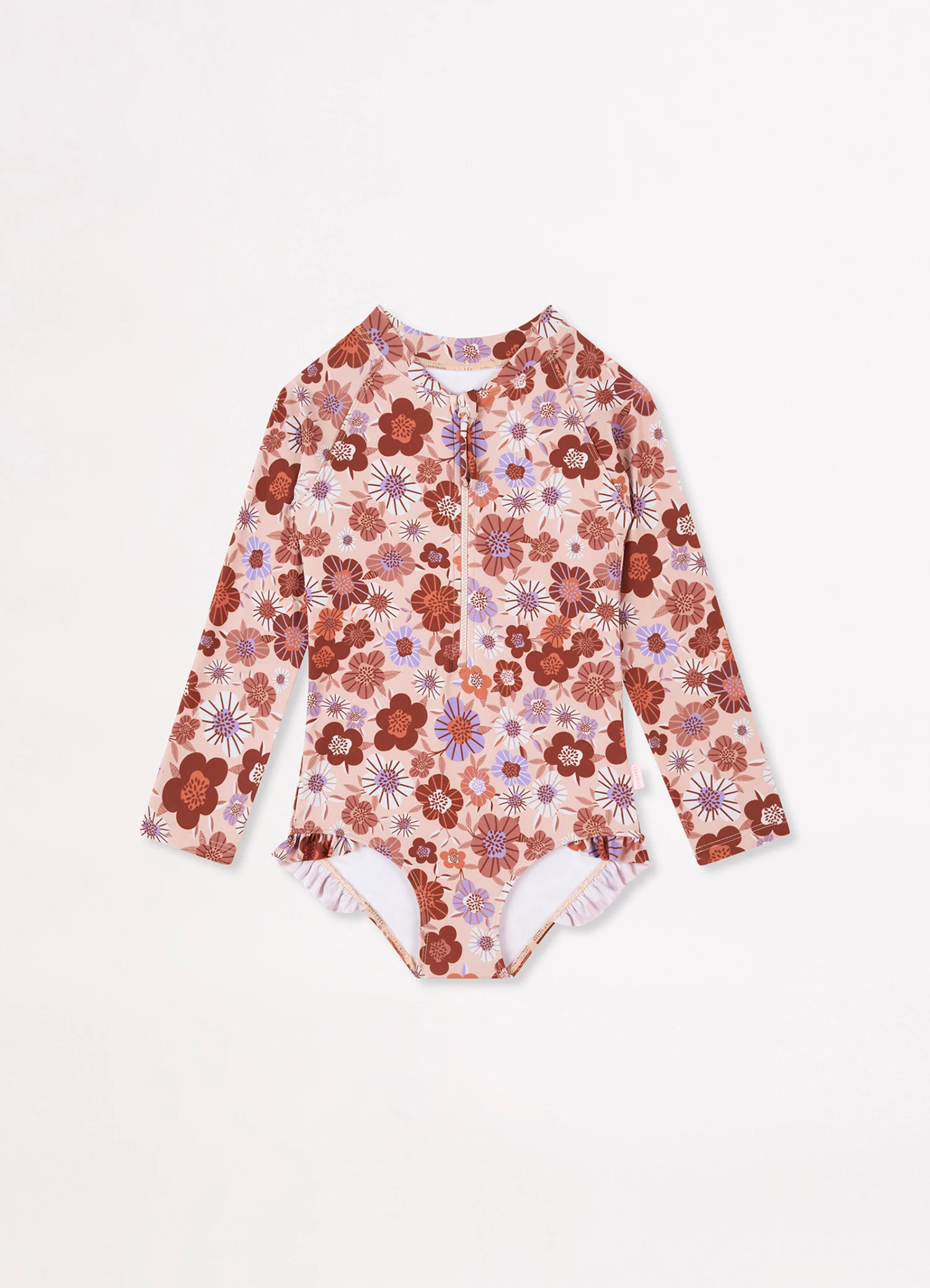 The Retro Longsleeve Ruffle Paddlesuit for girls is a full coverage protective surf suit with long sleeves and a zip front for an adjustable fit. This paddlesuit is complete with ruffles at the leg opening and a bold floral print.Β