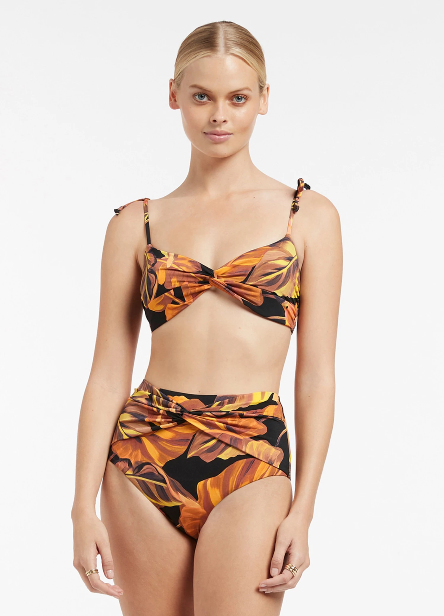 Our Palmas collection takes inspiration from the luscious flora of the tropical jungles of Latin America. This custom print is digitally printed on our signature Italian fabrication created using 100% regenerated yarn. Swim styles are trimmed with tortoise inspired hardware to further elevate each silhouette.