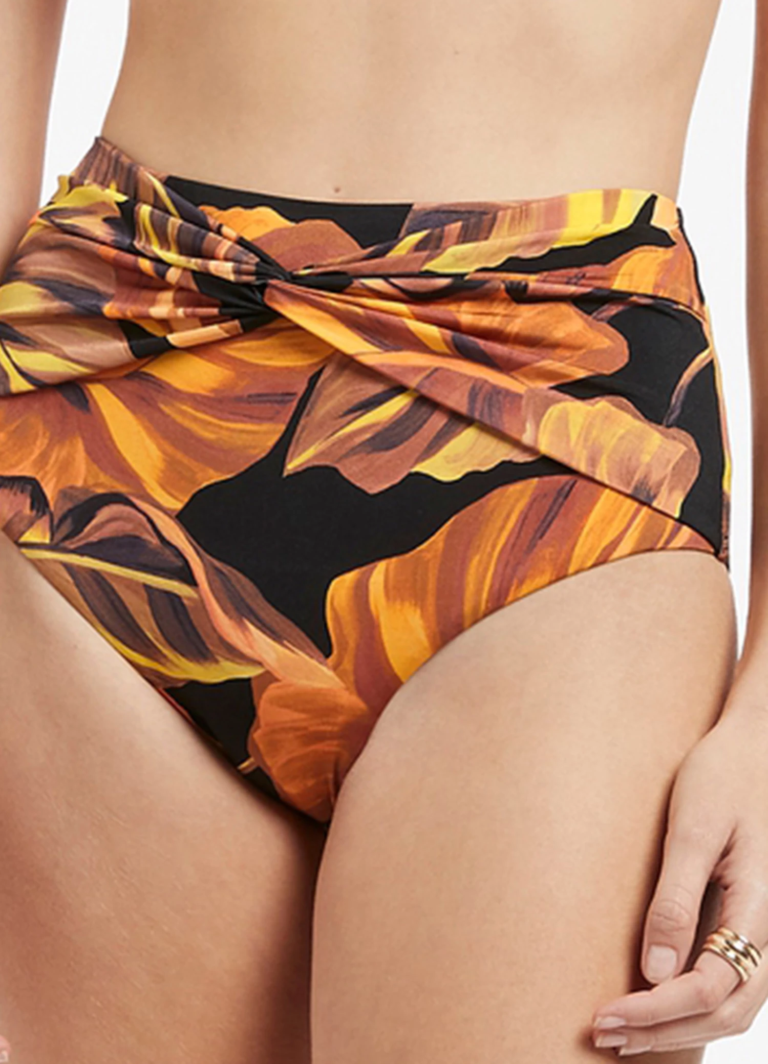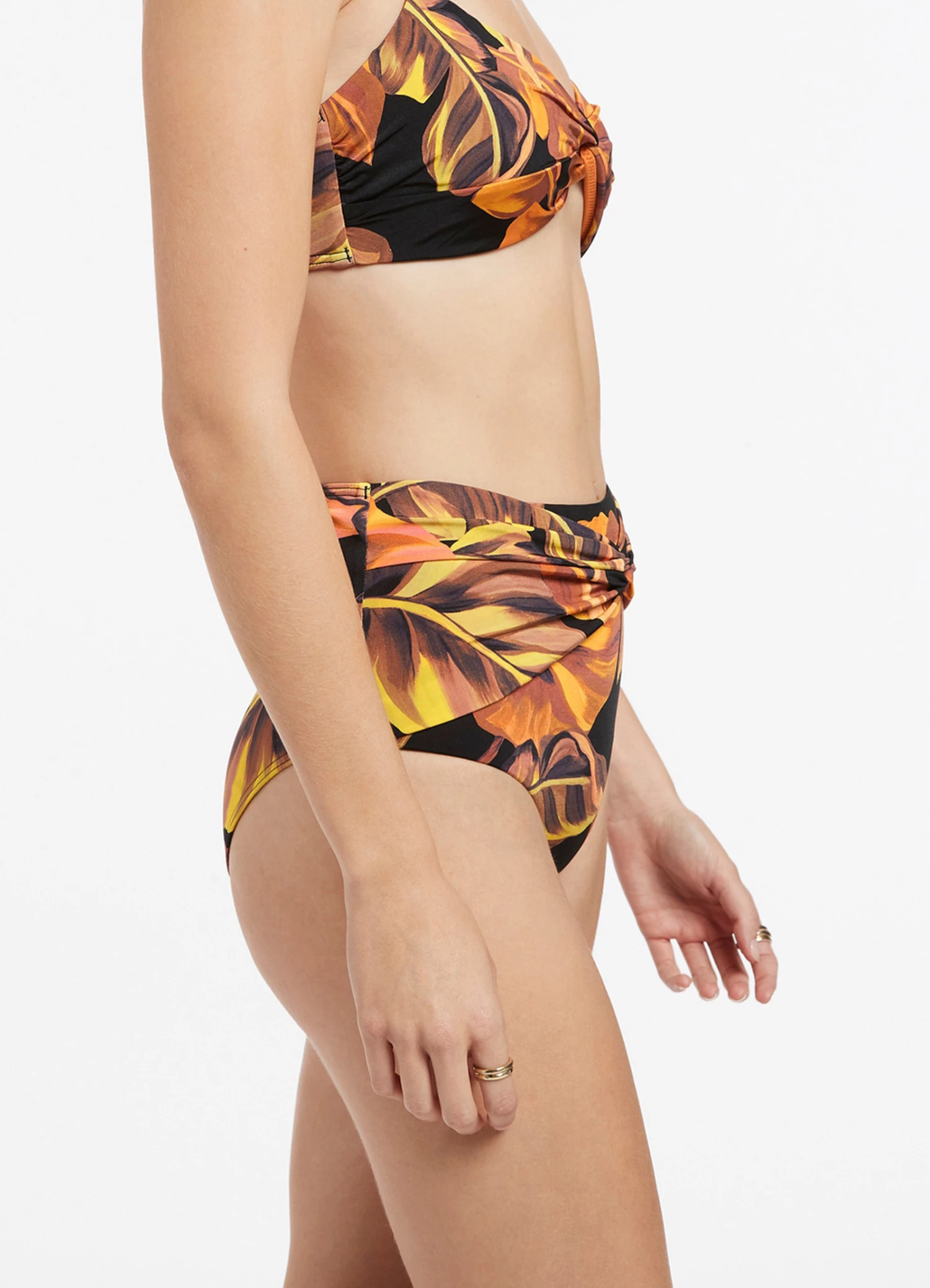 The Palmas Twist Front Bikini Bottom is a classic form-fitting swim silhouette. The twist front elevated detailing and high rise styling provides shape and coverage, complete with a tropical inspired print to craft a perfect warm weather bikini bottom.Β